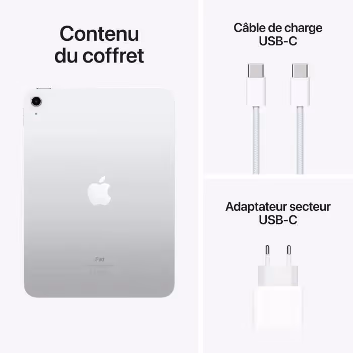 L'iPad 10È propose également une connectivité Wi-Fi 6, garantissant des connexions rapides et stables, ainsi qu'un port USB-C pour une recharge rapide et des transferts de données efficaces. Son design élégant et léger, dans une finition argentée, permet une prise en main confortable et un transport facile. L'autonomie de l'appareil peut atteindre jusqu'à 10 heures, ce qui vous permet de l'utiliser toute la journée sans souci.