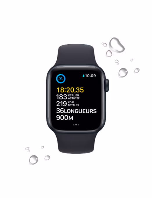 Conçue pour résister à vos activités, l’Apple Watch SE 2 est étanche et dispose d’une autonomie optimisée, vous accompagnant tout au long de la journée sans contrainte.