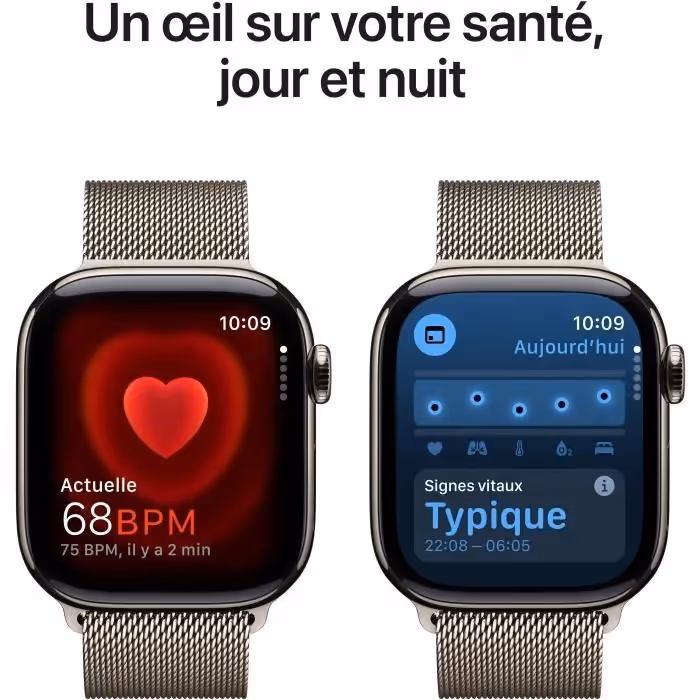 Apple Watch Series 10 GPS + Cellular 46mm – boîtier titane naturel, bracelet Milanese Loop, écran Retina, autonomie 18h, capteurs santé avancés. Disponible chez Techland.