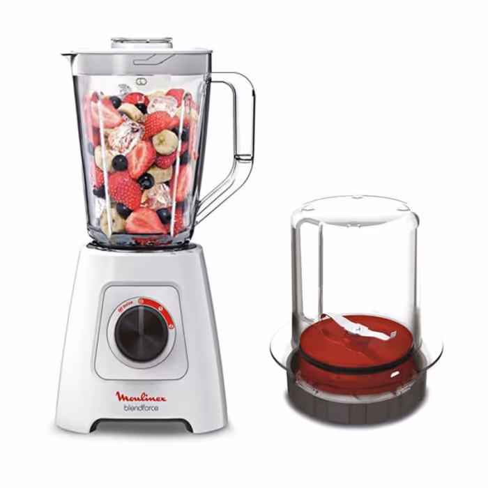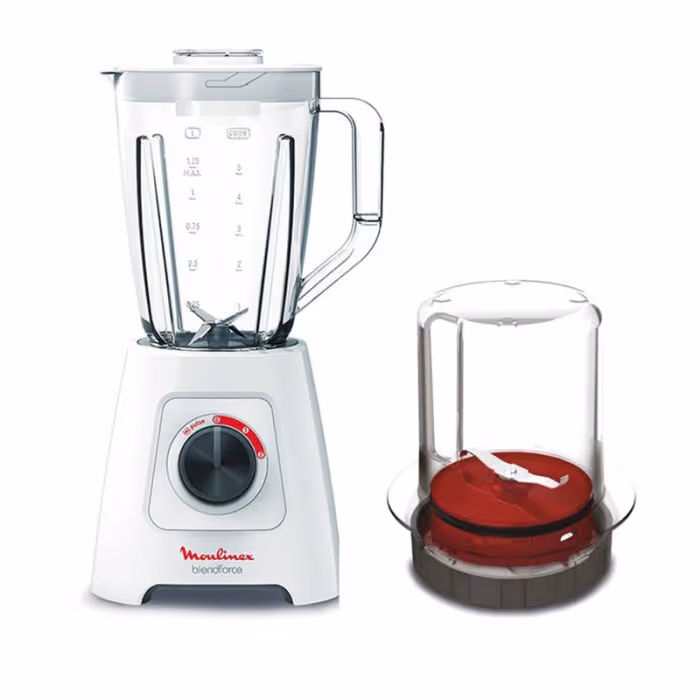Blender MOULINEX + Moulin - Puissance: 600 Watts - Capacité du Bol: 2 Litres - 2 Vitesses + Pulse - Lames en acier inoxydable - Smart Lock - Système Air Cooling - Pieds antidérapants - Couleur: Blanc - Garantie: 1 an