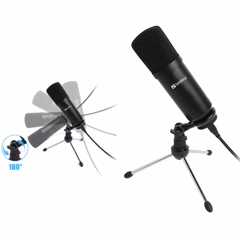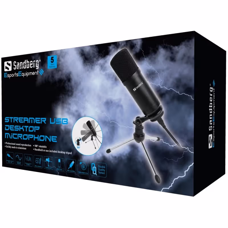 Microphone Sandberg Streamer 126-09 - Interface USB - Parfait pour les gamers et les stremers Frequence de response: 30 – 16,000Hz - Sensibilité -38 +/-3dB - S/N ratio: 70dB - Taux d'échantillonnage 192Khz/24bit - Niveau sonore: 16 dB Max - Fabriqué en métal robuste - Monté sur le trépied pratique - Garantie 1 an