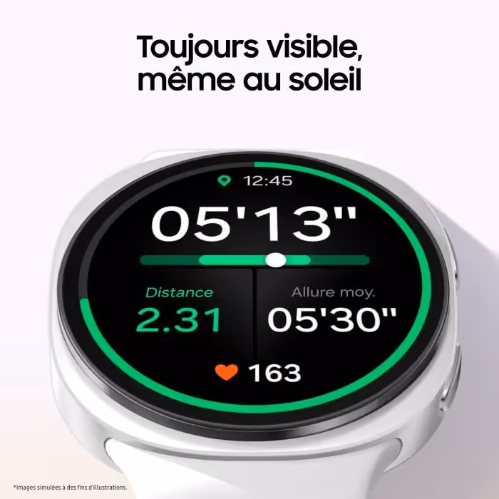 Profitez d’une qualité d’affichage exceptionnelle grâce à l’écran Super AMOLED de 40 mm avec une résolution de 438 x 438 pixels. Lumineux, réactif et agréable à lire même en plein soleil, il vous permet d’accéder à toutes vos informations d’un simple coup d’œil.