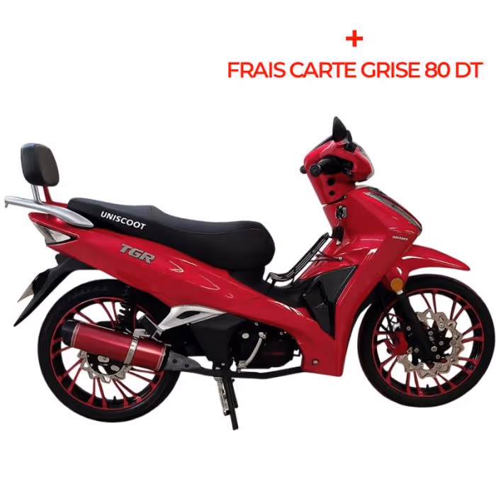Moto UNISCOOT Tiger - Moteur: 125 cm³ 4 temps - Vitesse Maximale: Digital 140 km/h - Transmission: 4 Vitesses - Pneus: 2.5/17 et 2.75/17 - Freins à disque avant et arrière - Avec alarme - Dimensions: 1950 x 650 x 1100 mm - Garantie: 5000 KM