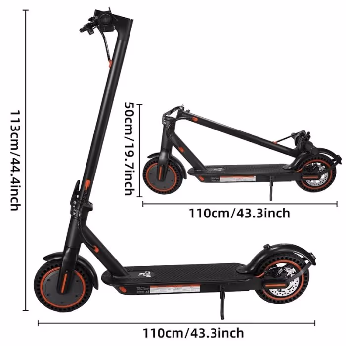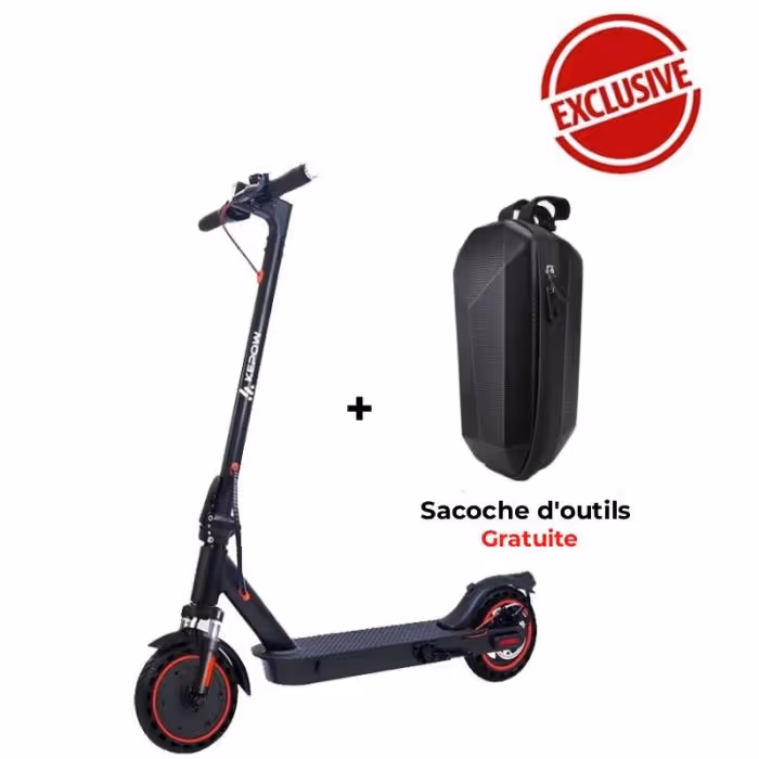 Trottinette Électrique KEPOW E9PRO10S - Puissance moteur: sans balais 350 Watts - 2 modes de vitesse -Vitesse maximum : 25 km/h - Capacité nominale de batterie: 36 V/10 Ah - Temps de charge: 4 à 5 heures - batterie au lithium - Autonomie batterie: 20 à 30 km (dépend de la capacité de la batterie, du poids de l'utilisateur et de l'état de la route, etc.) - Chargeur : 42 V/1,5 A - Prise de Chargeur: Norme Européenne - Charge maximale: 120 kg - pneu plein en nid d'abeille – Honeycomb - Frein électrique + système de frein à disque arrière Affichage - Phare avant à LED + feu stop arrière - Pliable - Fonction régulateur de vitesse – Cruise Control Avec Suspension Avant, AMORTISSEUR et Clignotants - Matériau: alliage d'aluminium - Capacité d’escalade : 15 degrés - Taille de roue: 8,5 pouces - Couleur: Noir - Garantie : 3 mois (sur batterie et chargeur). + Sacoche d'outils étanche Gratuite